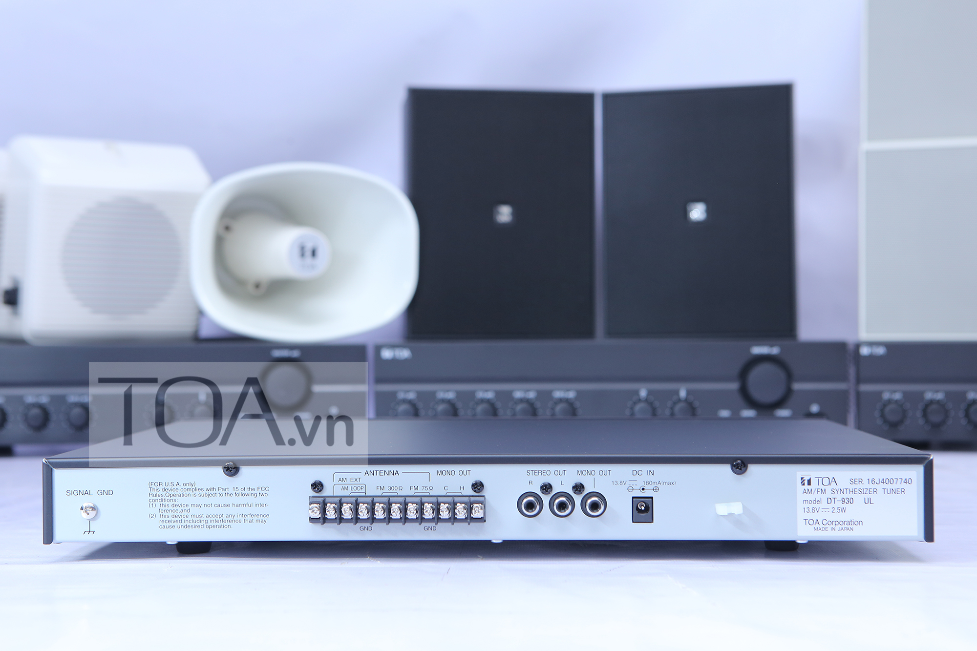 Bộ phát AM/FM TOA DT-930 được thiết kế để sử dụng kết hợp độc quyền với các bộ khuếch đại TOA 900 series của TOA. Nó có khả năng nhận và phát sóng stereo FM tổng cộng 40 đài FM và AM. Với việc được trang bị thêm giá đỡ tùy chọ