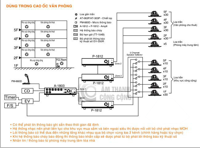 Hệ thống âm thanh thông báo, cảnh báo báo cháy: di tản, thông báo bản tin, phát nhạc nền BGM