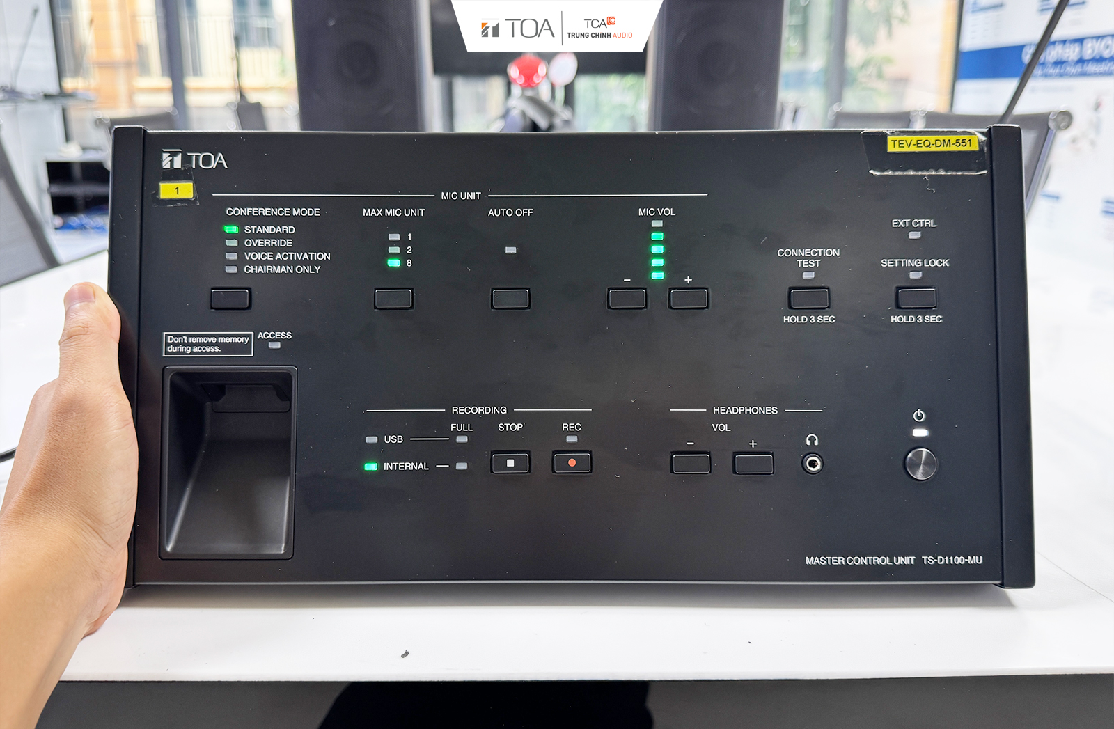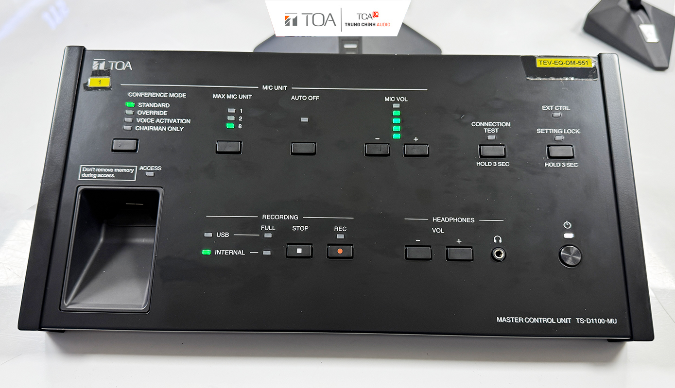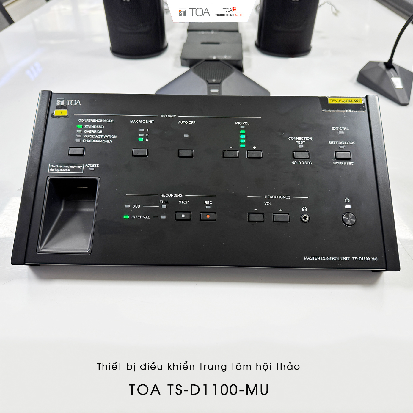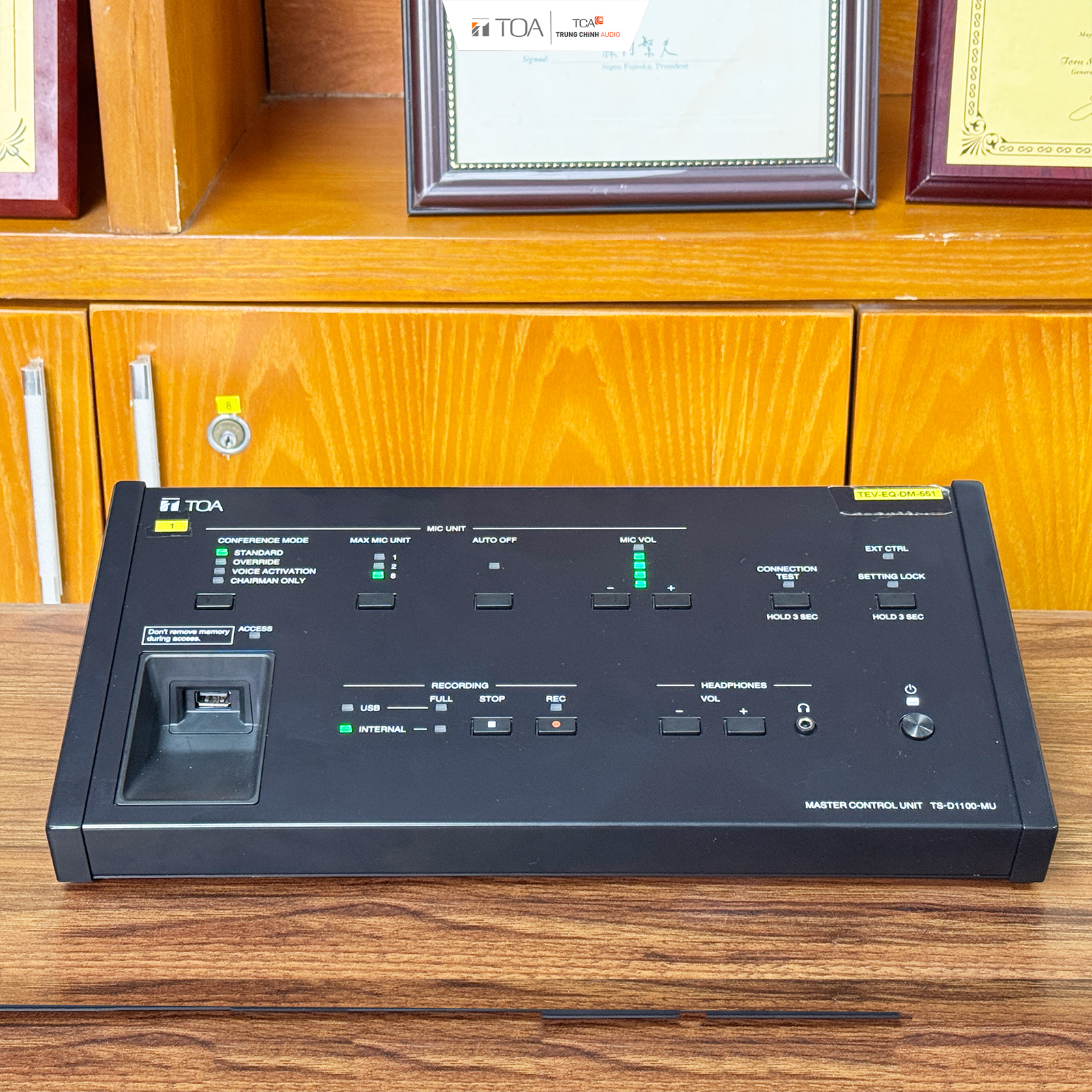 Bộ điều khiển trung tâm TS-D1100 được trang bị nhiều đèn LED hiển thị trạng thái, bao gồm nguồn, chế độ hội thảo, số lượng micro hoạt động, và các thông tin quan trọng khác như trạng thái ghi âm, bộ nhớ USB còn trống, và cảnh báo khi dung lượng bộ nhớ trong sắp đầy. Các phím chức năng như chọn chế độ hội thảo (tiêu chuẩn, override, kích hoạt bằng giọng nói, ưu tiên máy chủ tịch) giúp tối ưu hóa trải nghiệm hội thảo theo nhu cầu cụ thể của người dùng.