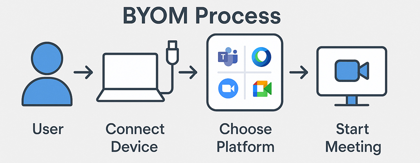 BYOM (viết tắt của Bring Your Own Meeting) là xu hướng công nghệ mới trong các phòng họp thông minh và hội nghị truyền hình hiện đại. Khác với giải pháp BYOD - "Bring Your Own Device" (mang theo thiết bị cá nhân), BYOM cho phép người dùng mang theo nền tảng họp trực tuyến quen thuộc của mình như Zoom, Microsoft Teams, Google Meet hay Webex, và kết nối trực tiếp với hệ thống camera, micro, loa, màn hình chuyên dụng trong phòng họp chỉ bằng một thao tác cắm dây hoặc kết nối không dây.