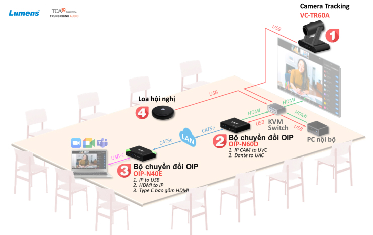 Hệ thống trong hình là một cấu hình BYOM tiêu biểu do Trung Chính Audio triển khai, được thiết kế dành riêng cho phòng họp doanh nghiệp quy mô vừa và nhỏ (6–12 người). Giải pháp sử dụng thiết bị OIP của Lumens để kết nối camera hội nghị, âm thanh và tín hiệu hình ảnh qua mạng LAN, giúp giảm dây nối, thi công gọn gàng và vận hành cực kỳ đơn giản.