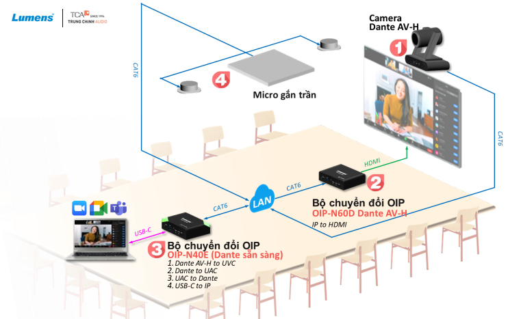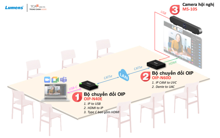 Đây là giải pháp BYOM Lumens dành cho doanh nghiệp vừa và nhỏ mà Trung Chính Audio khuyến nghị triển khai cho các không gian họp hiện đại. Chỉ với 3 thiết bị chính – OIP-N40E, OIP-N60D và camera MS-10S, người dùng có thể biến phòng họp truyền thống thành phòng họp thông minh, sẵn sàng kết nối mọi nền tảng hội nghị trực tuyến một cách linh hoạt, nhanh chóng và ổn định.