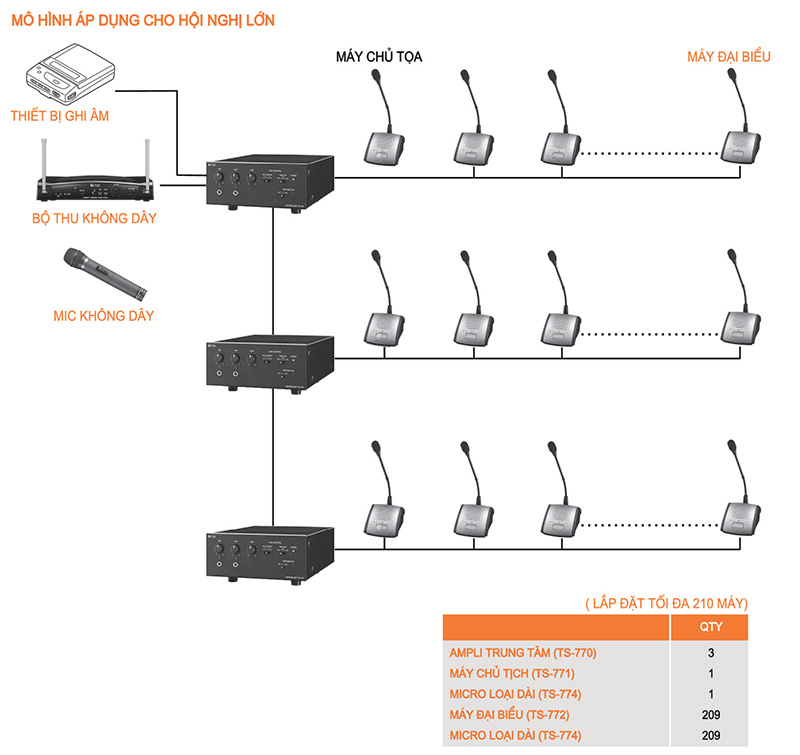 Những thiết bị âm thanh hội nghị trên đây được áp dụng cho hội nghị quy mô lớn. Giải pháp âm thanh hội thảo này, cho phép lắp đặt tối đa 210 thiết bị micro tích hợp loa trong một phòng hội nghị.