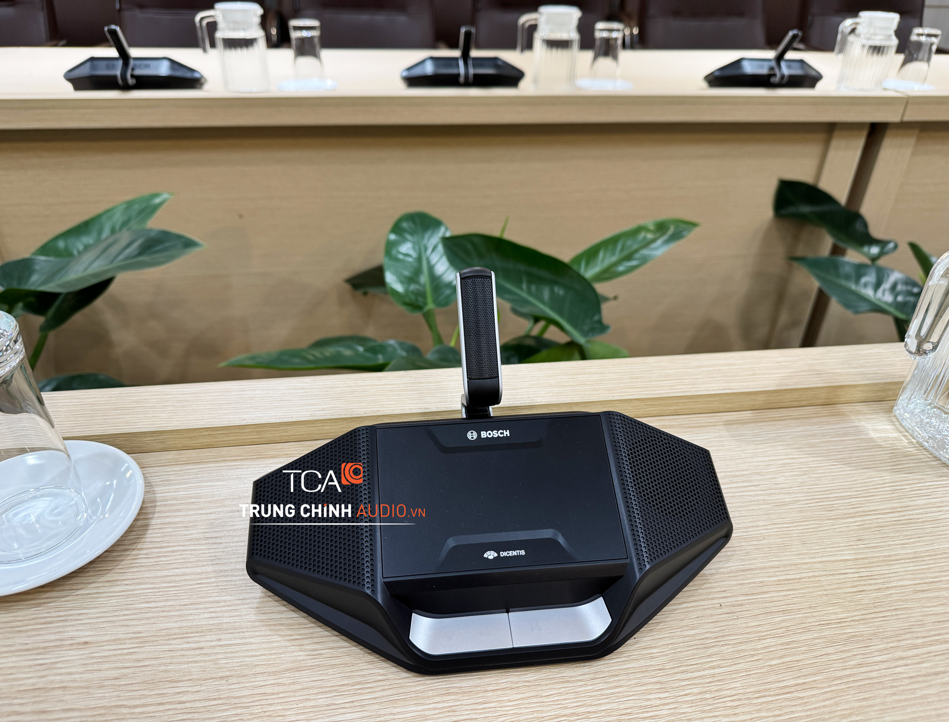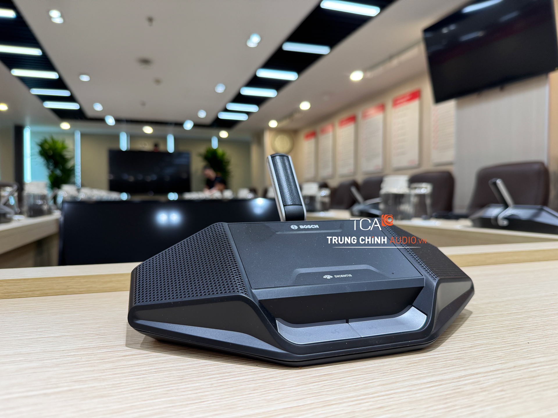 Khu vực bàn họp lõi sử dụng Bosch Dicentis có dây với thiết bị đại biểu model DCNM-D. Đây là cấu hình phù hợp cho phòng họp cần sự ổn định cao, đồng thời dễ quản lý vận hành: mỗi đại biểu có một vị trí micro riêng, phát biểu rõ ràng, hạn chế tình trạng “tranh tiếng” hoặc khó kiểm soát khi họp đông người.