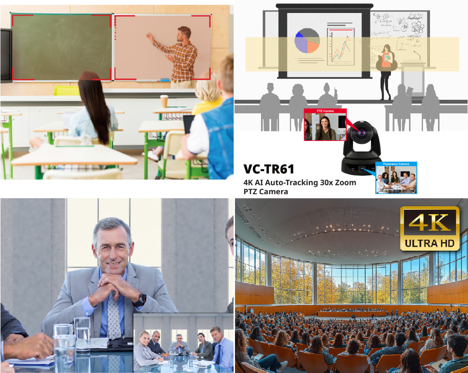 Trong lớp học/hội nghị: camera tự theo dõi giảng viên, chuyển góc quay khi người nói di chuyển.