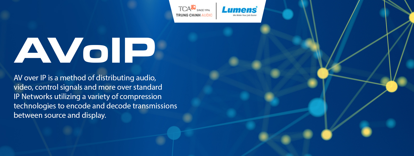 AVoIP (Audio Video over IP) là công nghệ truyền tải tín hiệu âm thanh và hình ảnh kỹ thuật số thông qua hạ tầng mạng LAN thay vì sử dụng cáp HDMI truyền thống. Công nghệ này giúp tối ưu hoá việc phân phối, mở rộng và quản lý nội dung video trong các hệ thống trình chiếu, điều khiển trung tâm, phòng họp hay giảng đường.