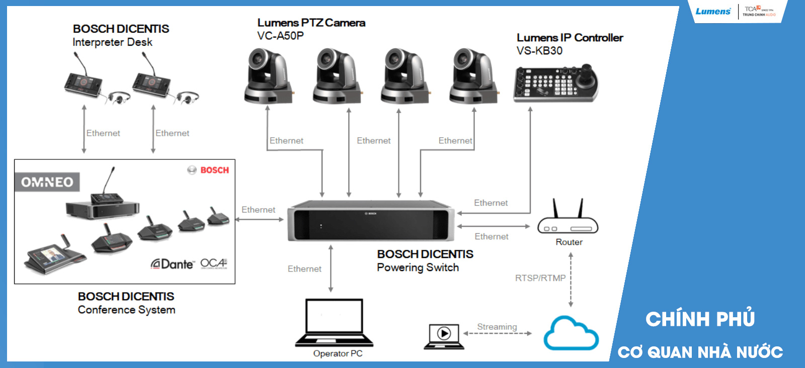 Sơ đồ kết nối hệ thống AV sử dụng camera Lumens và hệ thống Bosch Dicentis cho Văn phòng Chính phủ
