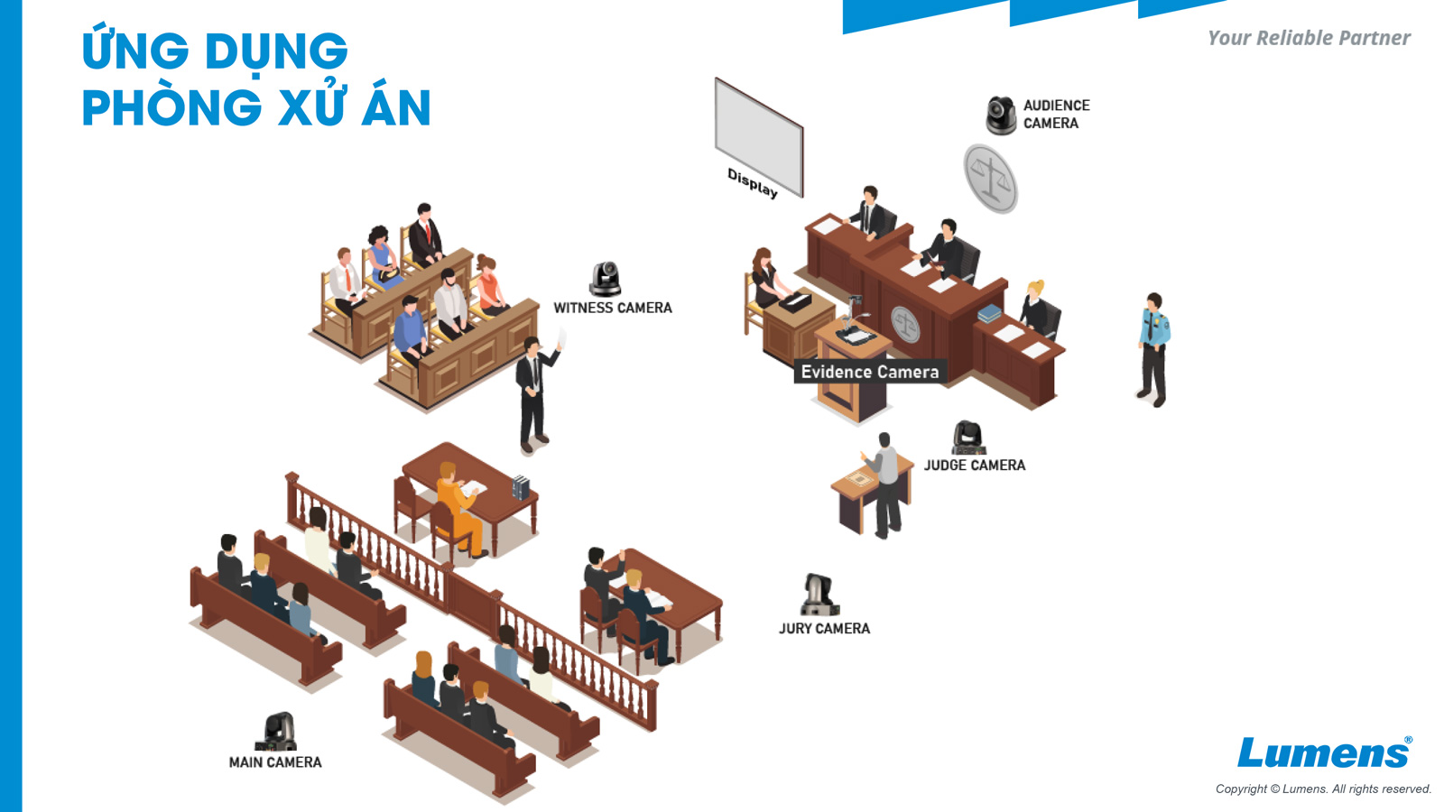 Giải pháp Lumens Courtroom Solution giúp biến một phòng xử án truyền thống thành phòng xét xử hiện đại, có thể ghi hình, truyền trực tiếp và lưu trữ dữ liệu số, đảm bảo tính minh bạch, công bằng và dễ dàng truy xuất cho các bên liên quan.