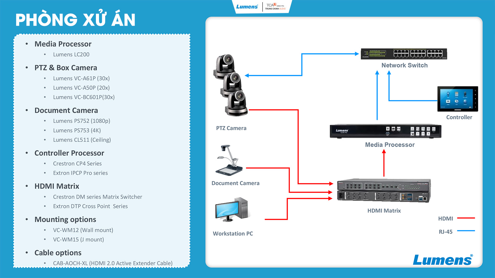 Hệ thống thiết bị trong phòng xử án Lumens được thiết kế tối ưu để ghi hình, trình chiếu và lưu trữ toàn bộ diễn biến phiên tòa một cách chuyên nghiệp và bảo mật. Giải pháp này tích hợp linh hoạt giữa camera PTZ, camera tài liệu, bộ xử lý LC200 và ma trận HDMI, mang đến hình ảnh rõ nét, âm thanh chuẩn xác và khả năng vận hành ổn định trong mọi tình huống xét xử.