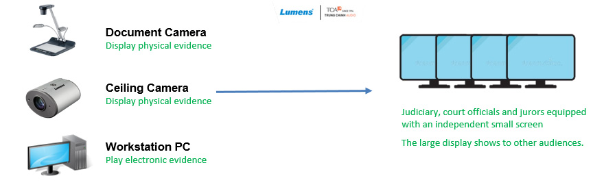 Camera tài liệu Lumens PS753 và camera trần giúp hiển thị vật chứng, tài liệu, hình ảnh X-quang, hoặc chứng cứ điện tử với độ chi tiết cao lên màn hình lớn. Mọi bằng chứng đều được trình bày trực quan, giúp thẩm phán, bồi thẩm đoàn và các bên dễ dàng quan sát, phân tích và đưa ra phán quyết khách quan.