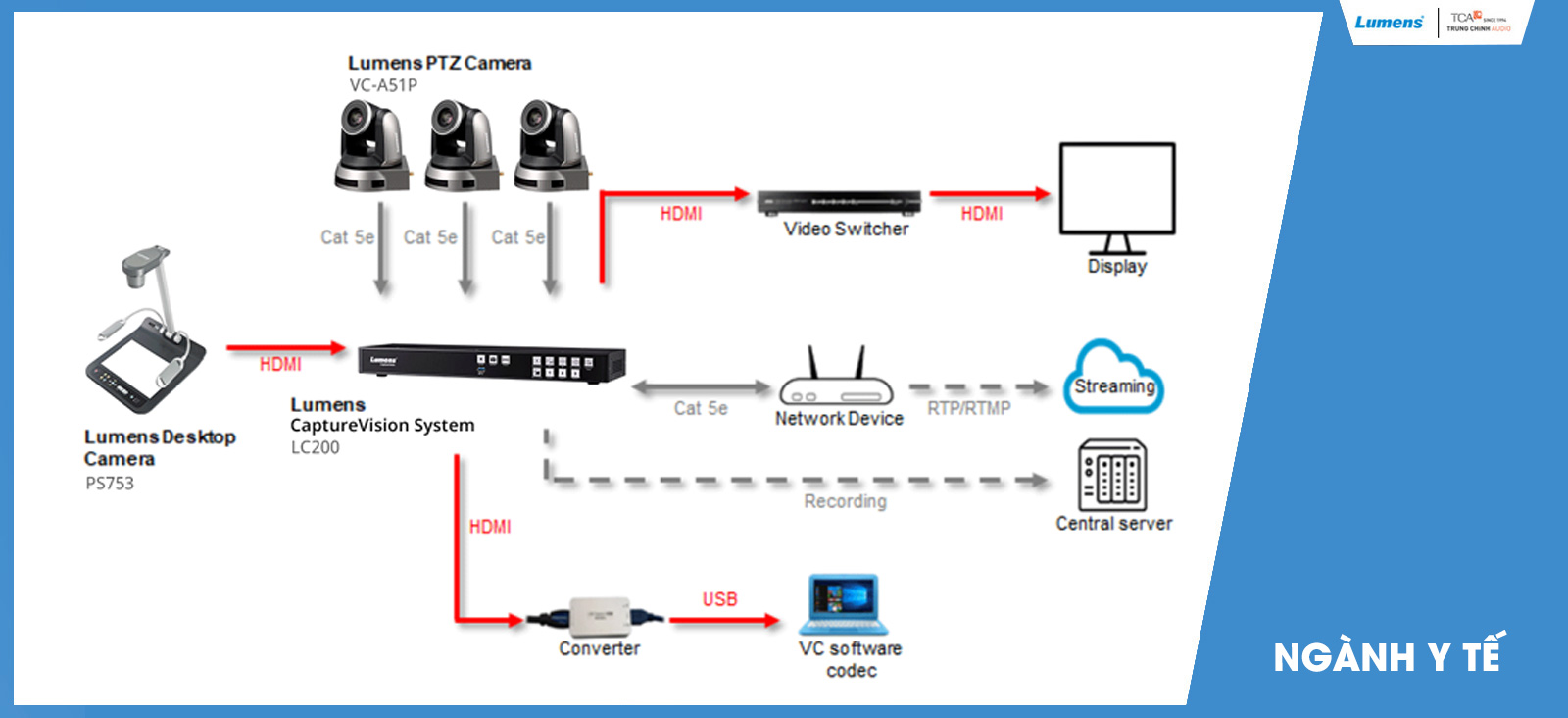 Các thiết bị Lumens LC200, PS753 và camera PTZ kết hợp cho phép ghi hình, phát sóng, và lưu trữ bài giảng, hội thảo y khoa chất lượng cao.