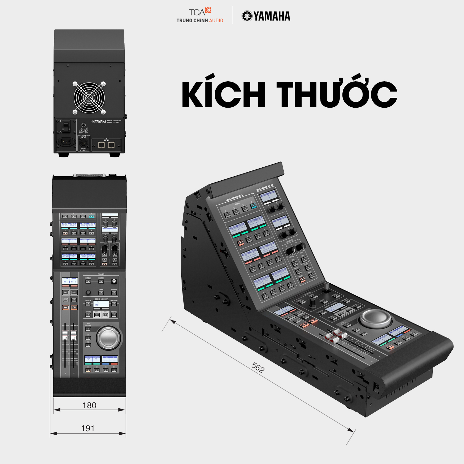 Trung Chính Audio giới thiệu layout kích thước tiêu chuẩn của Yamaha DM7 Control, giúp kỹ thuật viên, đơn vị thi công sân khấu – phòng thu – broadcast dễ dàng bố trí không gian bàn trộn, tủ rack hoặc mặt bàn điều khiển. Hình ảnh dưới đây mô phỏng đầy đủ góc nhìn trước, bên và tổng thể thiết bị theo đúng tài liệu kỹ thuật của Yamaha.